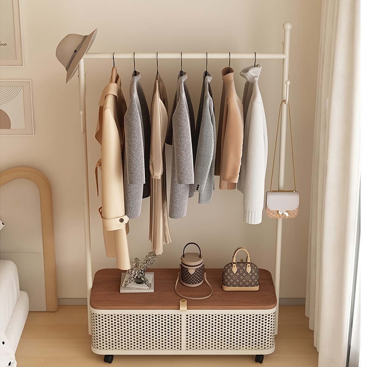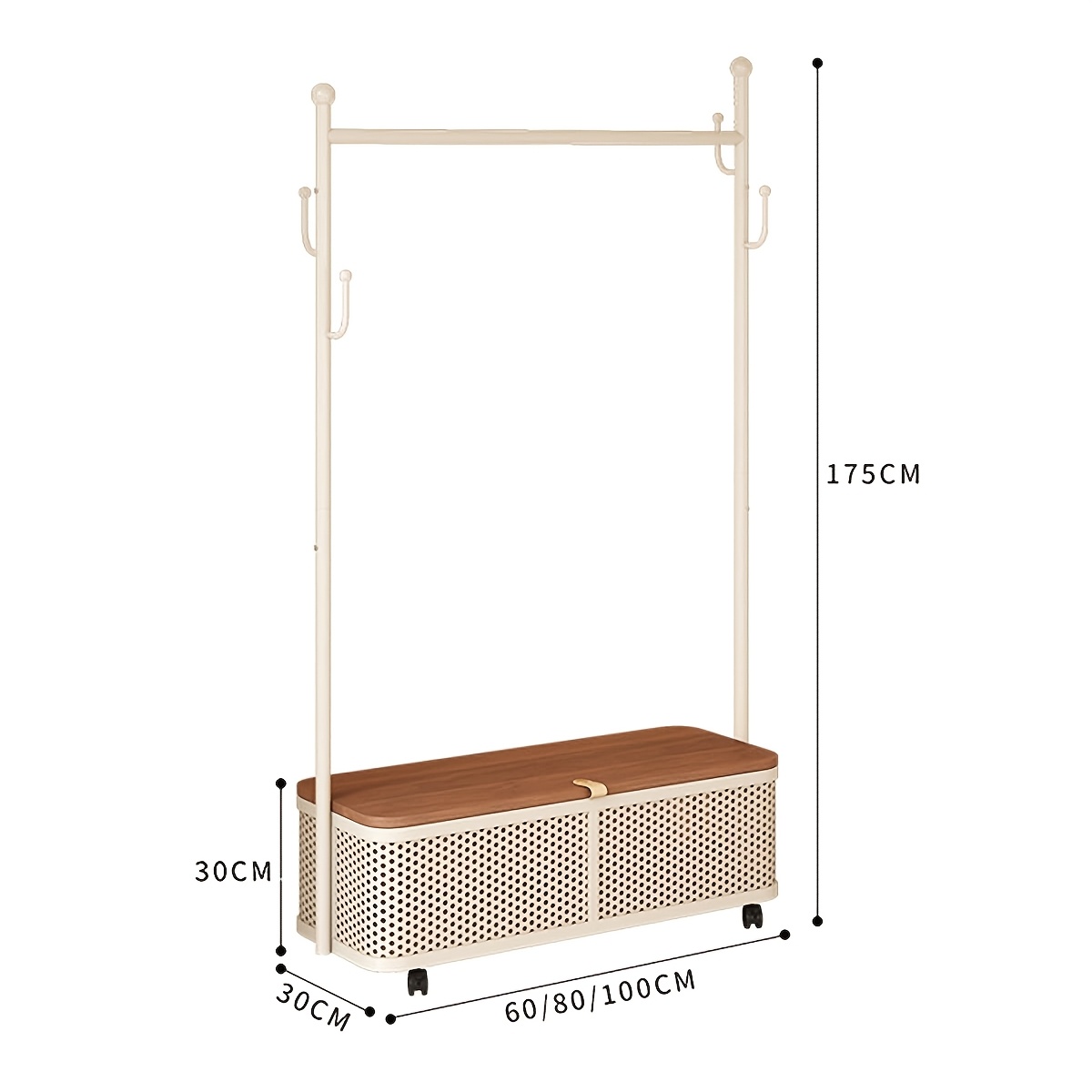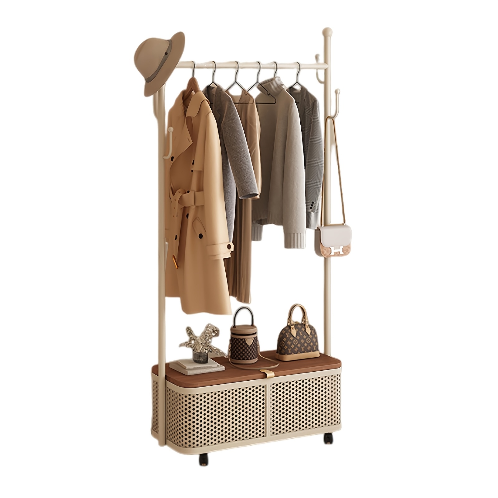 A Hall Tree Featuring a Bench And Shoe Storage, Equipped with a Layered Coat Rack Made of Carbon Steel, Capable of 360° Rotation. Ideal for Use in Bedrooms, Offices, Or Entryways, It Is Easy to Assemble And Comes in a Cream White And Walnut End